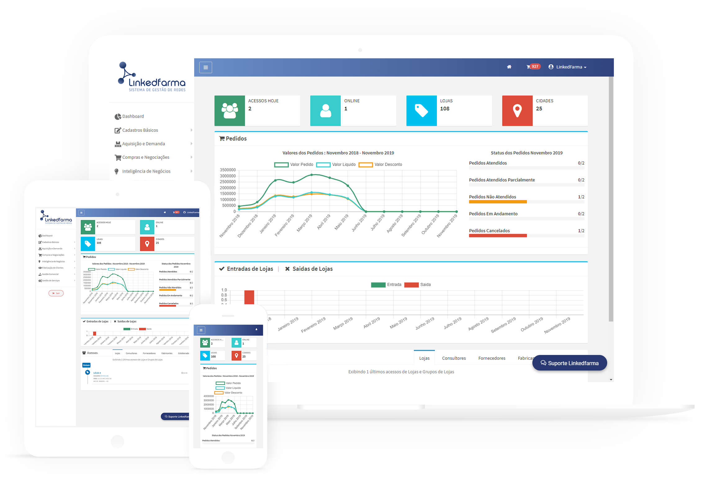 O portal LinkedFarma é uma aplicação SaaS que integra dados, pedidos e campanhas de farmácias e drogarias associadas ou franqueadas, possibilitando a gestão centralizada como uma rede única.